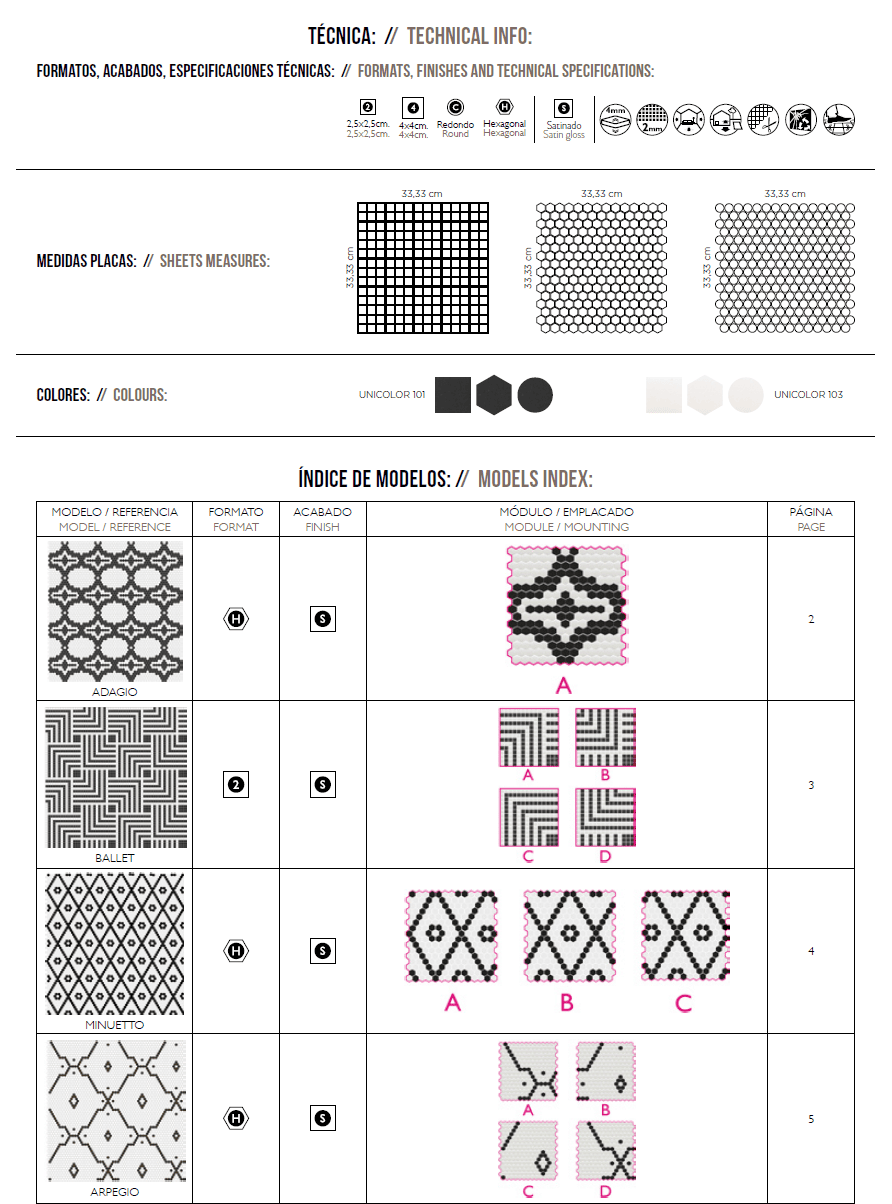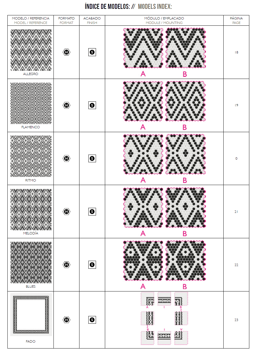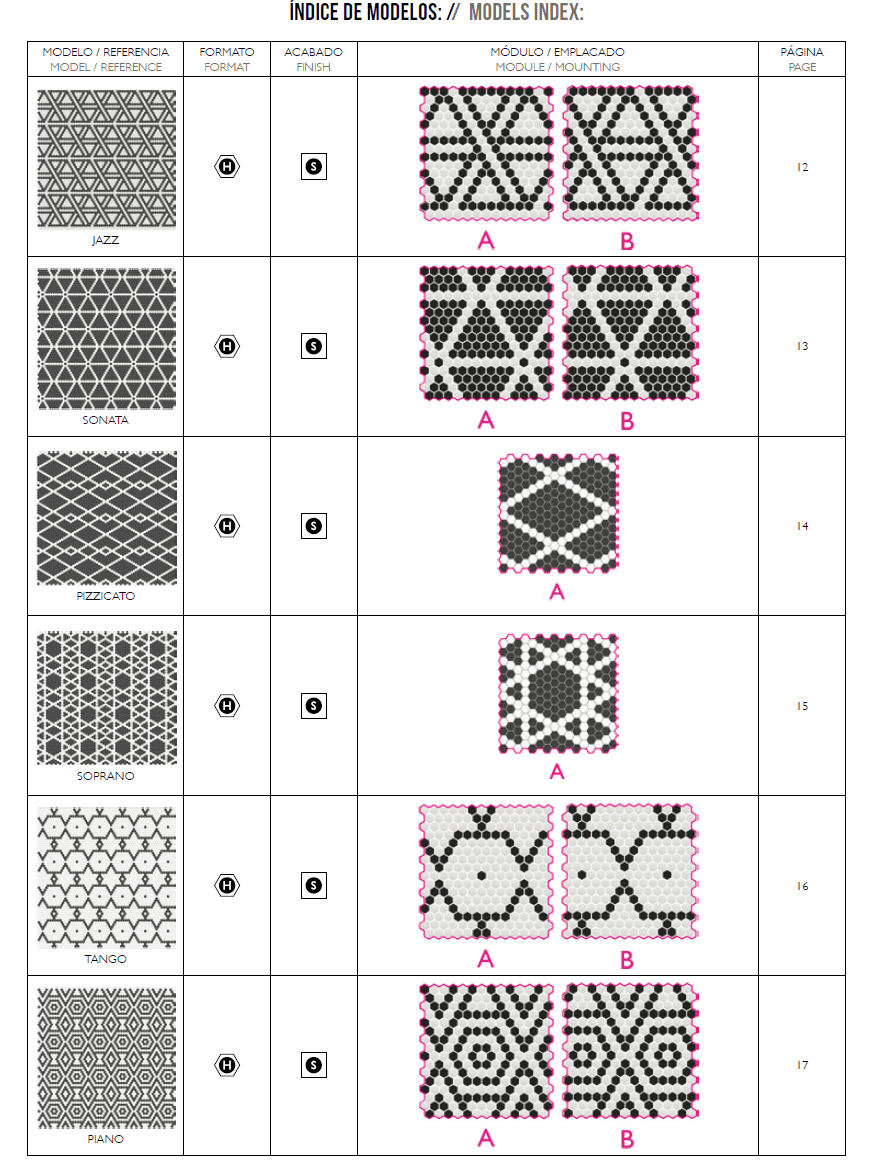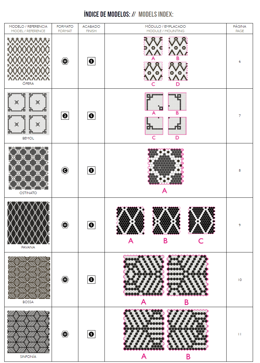 Explore our diverse tile collection with the Model Index, designed for easy navigation and quick reference. Each listing includes a detailed preview of the design, technical format, finish type, mounting options, and corresponding catalog page.